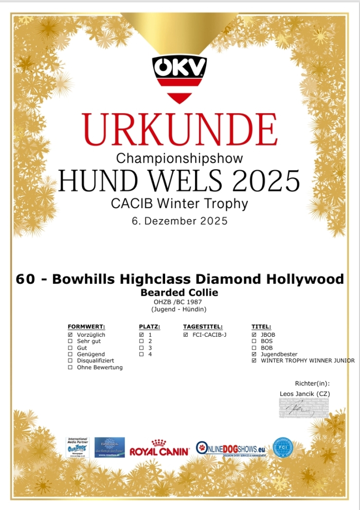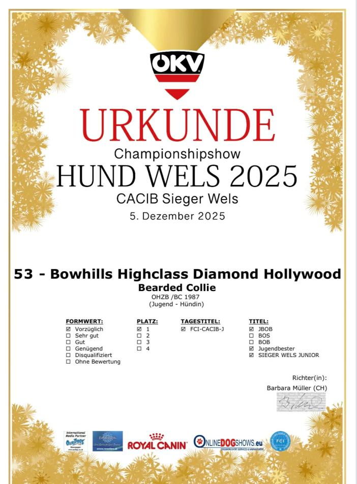 05. bis 07. Dezember 2025 3x International, 1x National Championship Dogshow in Wels Bowhills Highclass Diamond Hollywood aka Holly (Jugendklasse) hat mit ihrem Frauchen ein wunderschönes, erfolgreiches Vorweihnachts-Wochende in Wels verbracht: